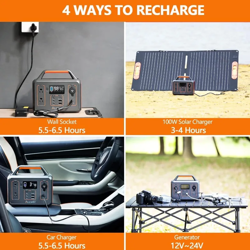 【3 Ways To Recharge, Built-in MPPT Controller】It can be recharged by AC Wall Charging, car charging, and solar panel charging, Fully charged by AC charging: 5.5-6.5 hours, car charging: 4.5-5.5 hours, and 100W solar panel charging: 3-4 hours in full sunlight.